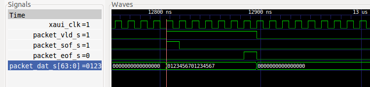 ... and a simple example of what it looks like clock by clock. Here there are 7 cycles of valid data, so 7 * 64bits = 448bits, which is 56 Byte packet. Making it an illegal runt packet e.g. less than the minimum packet size of 64Bytes.