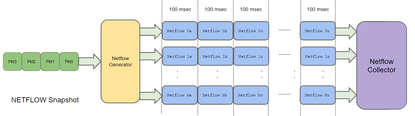 Enter Snapshot Netflows, the recommended approach on FMADIO 100G Packet Capture systems. Its full packet netflow generation (no loss), however the flows (not the packets) are output at regular intervals. This means you get full flow information, that also shows bandwidth profiles of each flow over time. For example using a netflow snapsnot at 100msec intervals, will output all the flows it finds within that 100msec interval, clear the flow log and start calculating flows again on the next packet.
